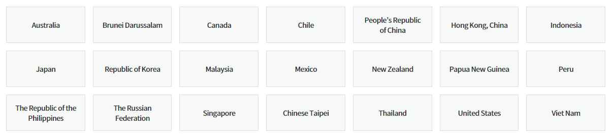 대한민국을 비롯해 미국, 일본, 중국, 캐나다, 호주, 뉴질랜드, 싱가포르, 인도네시아, 태국, 필리핀, 베트남, 말레이시아, 브루나이, 멕시코, 칠레, 페루, 러시아, 홍콩, 대만, 파푸아뉴기니 등이 참가합니다.