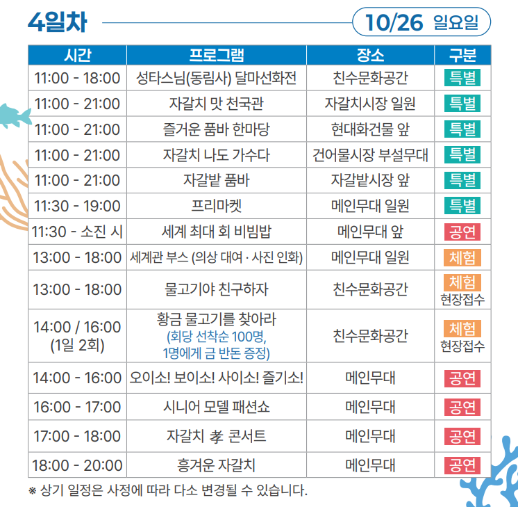 “오이소! 보이소! 사이소!”라는 정겨운 슬로건 아래, 부산의 정체성과 해양 문화를 널리 알리는 대표 축제이기도 합니다. 일부 체험이나 먹거리만 유료로 운영됩니다. 매년 수십만 명이 찾는 만큼, 바다와 사람, 그리고 문화가 하나로 어우러지는 진정한 부산의 축제를 느낄 수 있습니다.